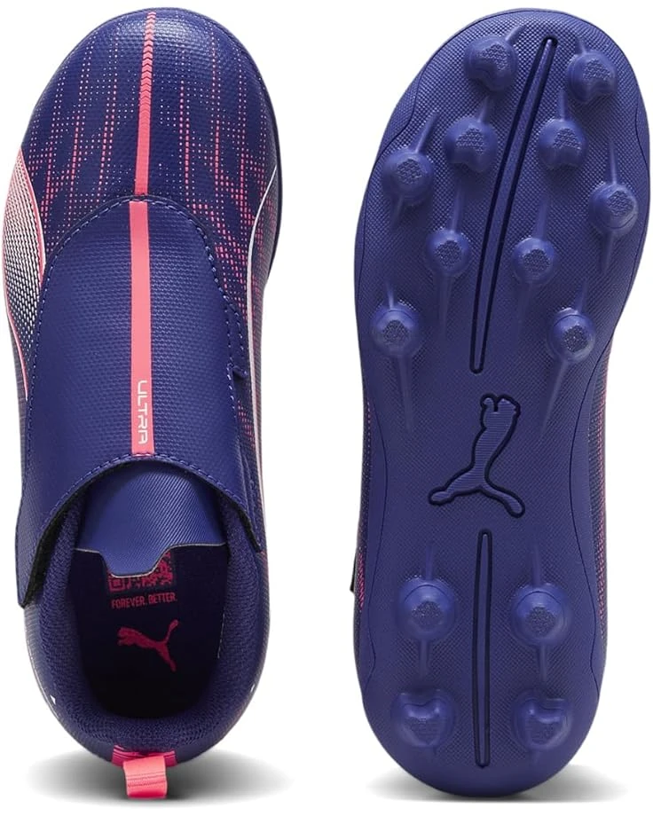 - Show off an ultra-fast performance as you step into the field wearing PUMA® Kids Ultra Play Hook And Loop Firm Artificial Ground Shoes. The lightweight yet durable synthetic upper with a debossed support frame ensures stability with every step and the hook-and-loop strap across the top allows an easy slip-on & secure fit. These round-toe shoes are designed with a polyester lining, rubber insole, and an ankle pull tab for donning & doffing.