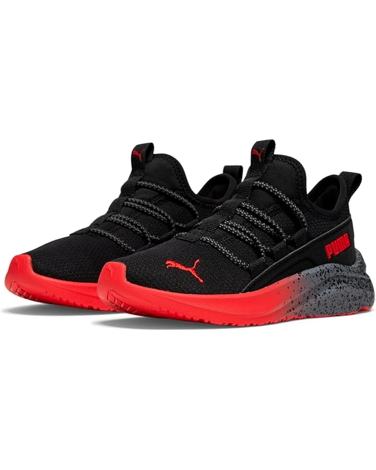 - Your little one will be ready for any adventure in the PUMA One4All Slip-On Splatter Fade sneakers. These slip on style sneakers feature bunjee laces and pull tabs on the heels and tongues. The PUMA logos are features on the toes and heels of the uppers.